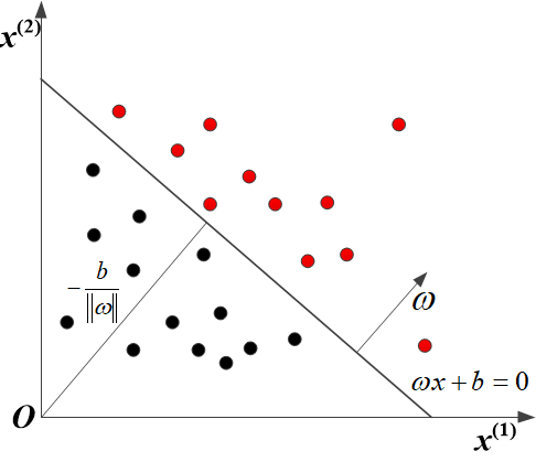 For input space (featured space) $\mathcal{X} = {{\mathbf{R}}^{n}}$ and output space $\mathcal{Y} =\{-1, +1\}$, the perceptron model can be built by: $$f(x) = sign(\omega \centerdot x+b)$$ $$sign(x) = \begin{cases} +1 & \text{if } x \ge 0,\\ -1 & \text{if } x < 0. \end{cases}$$ where $\omega$ and $b$ are the weight and bias for the above function respectively. Through being trained by the give training data $T = \{ (x_0, y_0), (x_1, y_1), (x_2, y_2), \cdots, (x_N, y_N)\}$, where $x_i \in \mathcal{X} = {{\mathbf{R}}^{n}}$ and $y_i \in \mathcal{Y}=\{-1, +1\}$, $i = 1, 2, \cdots, N$. The parameters $\omega$ and $b$ can be leanned through the mentioned data set. The learned linear hyperplane can divide the training data into two parts labelling +1 and -1. The schematic diagram is shown as follows.
